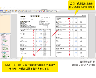 品目/費用別の段組み表現![明細2段組編集機能]従来、ページを分けて入力していた見積明細を2段組で1ページに表現することで、見やすくて分かりやすい見積書の作成を実現する「明細2段組編集機能」を新搭載。
