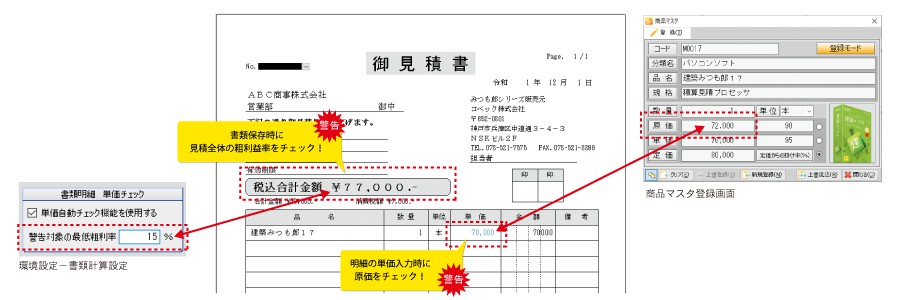 また、全体の合計金額が指定粗利率を下回っている場合も、書類保存時に警告メッセージが表示されますので、明細内容を再度見直すことにより、常に一定の利益を確保した見積作成を実現します。