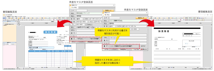 利用書式を登録した得意先マスタを流し込むだけの簡単操作で、目的の書式にワンタッチで切り替えることが可能です。たとえば、先方指定の書式で印刷が必要な場合や、異なる自社名情報が登録された書式を得意先毎に使い分けている場合など、書式を切り替える手間を軽減し、作業効率を向上させます。