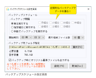 「みつも郎20」を起動しなくても、任意の間隔や開始時刻、バックアップ先などをあらかじめ設定すれば、定期的に実行してくれる「スケジュールバックアップ機能」や、誤って保存せずに編集書類を閉じてしまった場合などに備えた「書類データ自動保存機能」も新搭載。データ消失など万が一のトラブルに備えた万全のデータ管理環境を実現します。