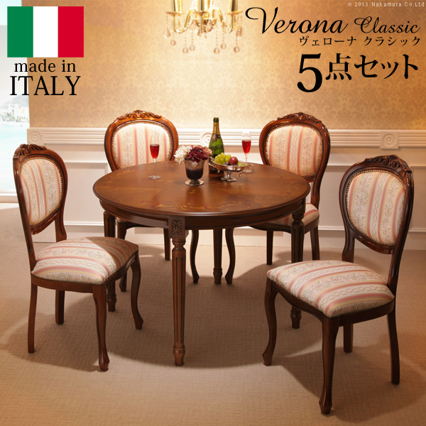 イタリア 家具 ヴェローナクラシック ダイニング5点セット:テーブル幅110cm+チェア-ミックスピンク4脚 猫脚 輸入家具 アンティーク風 イタリア製 おしゃれ 在宅