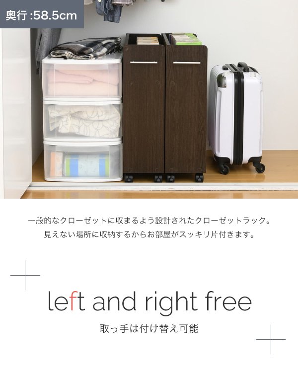 | ■商品説明 キャスター付きの便利なクローゼットラック2個組。 取っ手はどちらにも取り付け可能なので、収納箇所の向きは左右入れ替えできます。 本やメディア類や、日用品のストックなどの収納にぴったり。 クローゼット内のスペースを有効活用するのでお部屋をすっきり片付けられます。 ■本体サイズ [外寸](1個あたり)幅19.5×奥行58.5×高さ65.5cm ■組立時間(目安)(大人2人) お客様組立(45分) ■キーワード 収納ラック 一人暮らし 省スペース 薄型 キャスター キャスター付 本 漫画本 マンガ 日用品 生活用品 バッグ 箱 ランドセル 帽子 3段 木製 木 ホワイト 白 ナチュラル ダークブラウン 大容量 ウォーク イン クローゼット | |