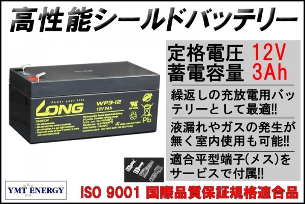 ■LONG 12V3Ah シールドバッテリーの主な性能■【フルメンテナンスフリー】充電時に発生するガスは内部で吸収されるので電解液の補水は不要です。【特殊シーリング設計】上下逆に使用しても液漏れしません。【高信頼・高性能極板組成の使用】自己放電が減少、容量保持特性はアップ、また過放電後の充電回復力を改善、耐過放電特性もアップしています。・定格容量:12V3Ah(容量は20時間率で計算されています)