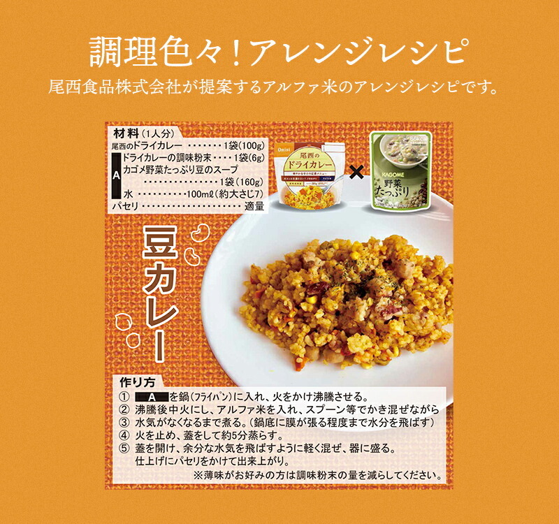 | うるち米(国産)、味付乾燥具材(さやいんげん、味付玉ねぎ、コーン、人参)、調味粉末(食塩、砂糖、カレーパウダー、オニオンパウダー、コーンスターチ、たん白加水分解物、ターメリックパウダー、ガーリックパウダー、クミンパウダー、コリアンダーシードパウダー、食用植物油脂、パセリ)/調味料(アミノ酸等)、微粒酸化ケイ素、リン酸カルシウム、香料、トレハロース、酸化防止剤(ビタミンE) |