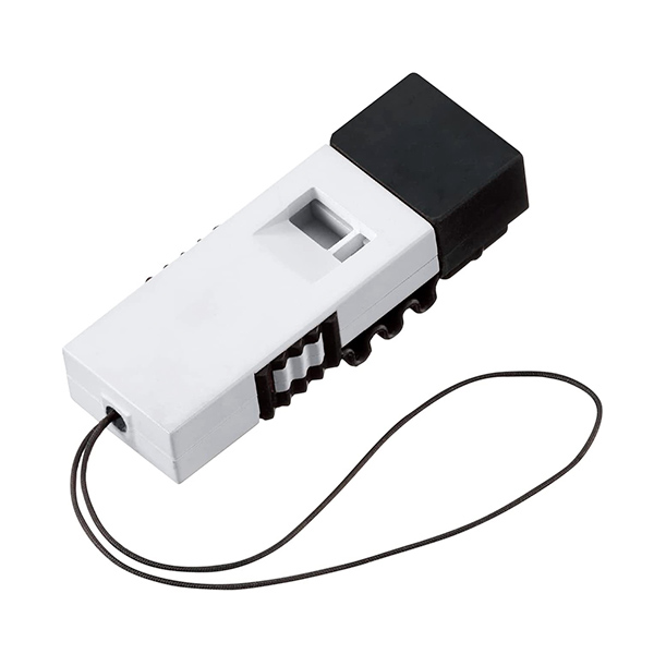 ネックストラップや携帯電話に取り付けられ、吹き口にキャップが付いているので衛生的に常備できます。
