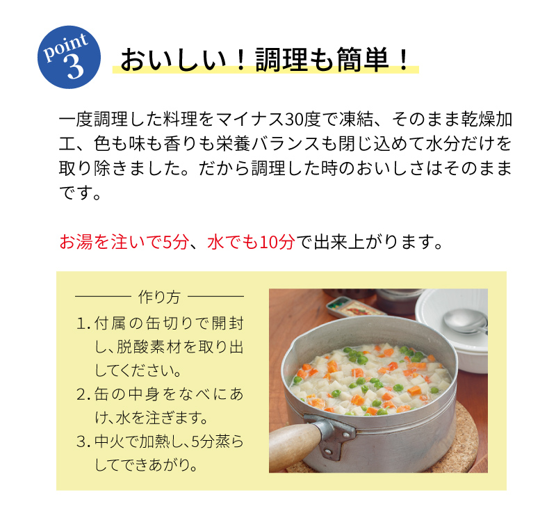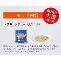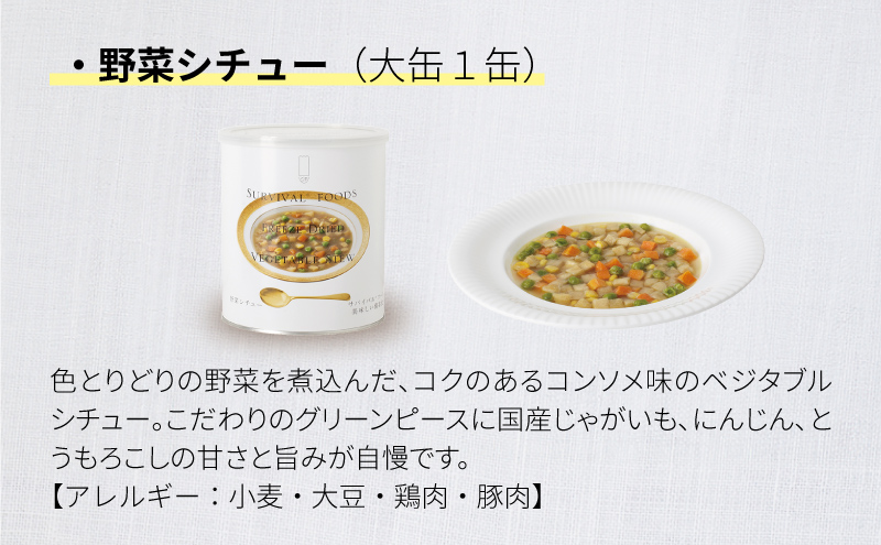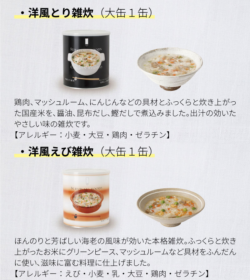 | ・クラッカー(910g): 2缶(大缶) ・チキンシチュー(422g): 1缶(大缶) ・野菜シチュー(344g): 1缶(大缶) ・洋風とり雑炊(408g): 1缶(大缶) ・洋風えび雑炊(408g): 1缶(大缶) |