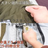 破損部位の大きいものは縫製後、熱圧着シートから接着、熱が冷めてから表面を応急ストレッチシールで補修。順序を違えると、ストレッチシールが溶けます。
