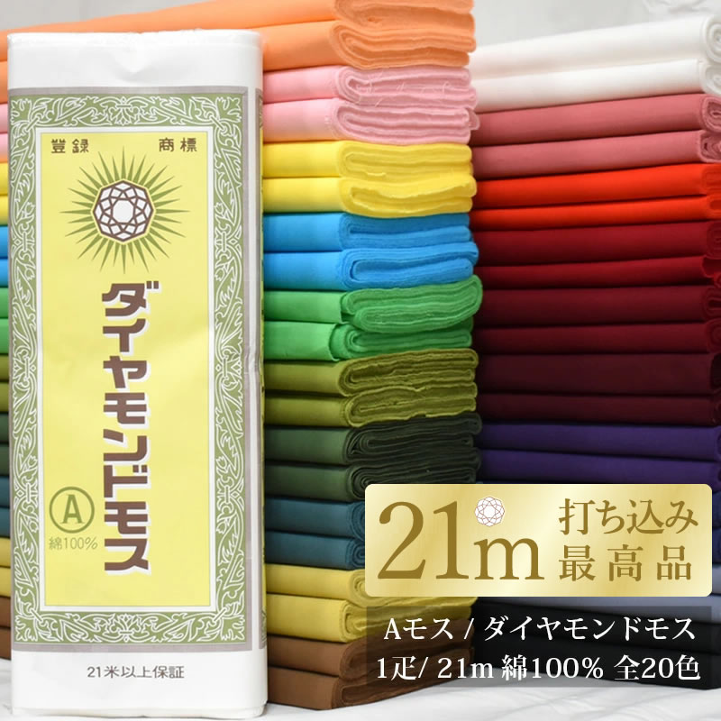 ダイヤモンドモス(Aモス、新モス、ナイスモス、新毛斯、金巾(かなきん)規格:約巾36cm×長さ21m以上 綿100% 日本製綿や羊毛などの単糸で平織りした薄地の織物「モスリン」です。もともとは洋毛布ですが、日本には幕末から明治初期に伝わり、着物など幅広く使われてきました。現在では半纏やタスキ、鈴緒などに使われます。絹のようにドレープ性に富み、暖かく蒸れにくい素材です。ヨーロッパから日本に伝わり、独自の発展を遂げた「モスリン」は日本の財産とも言えるものなのです。巾のある生地を3等分に切った生地となりますので、耳あり・耳無しが混在します。これらをお選びいただくことはできませんことご了承下さい。(両端のものは耳あり、まん中のものは耳なし)