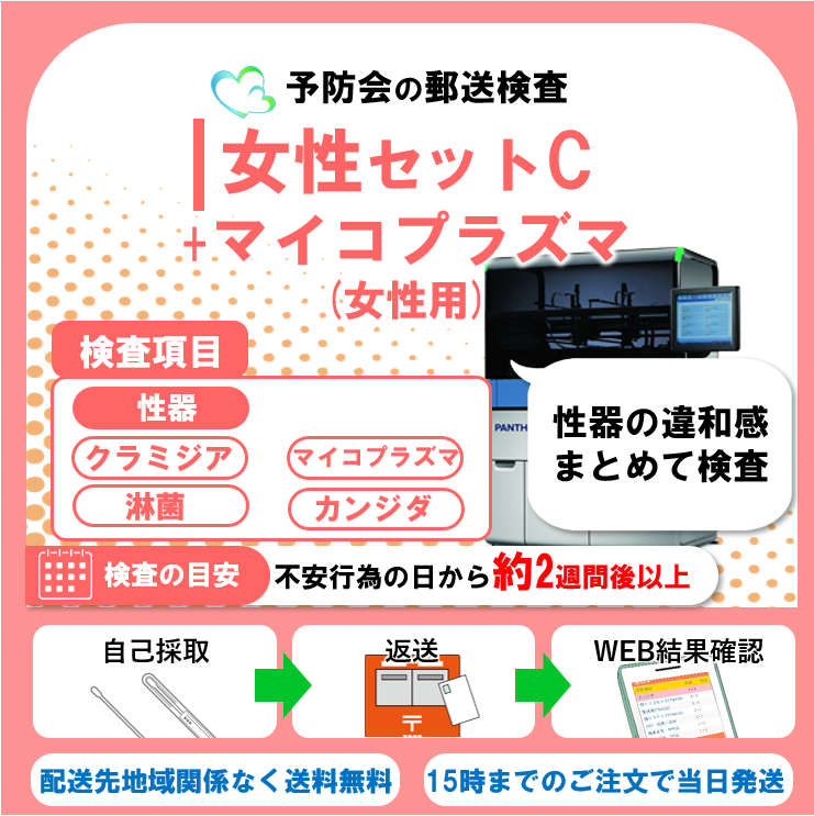 女性セットC+マイコプラズマ 7項目:性器クラミジア/性器淋菌感染症/マイコプラズマ・ウレアプラズマ感染症/性器カンジダ症 郵送性病検査キット
