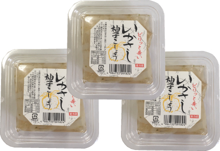 原材料:いか、食塩、ゆずこしょう(唐辛子、食塩、柚子)、豆板醤/ソルビット、調味料(アミノ酸等)、酒精、グリセリン、増粘多糖類、酸味料、(一部に小麦・いか・大豆を含む)