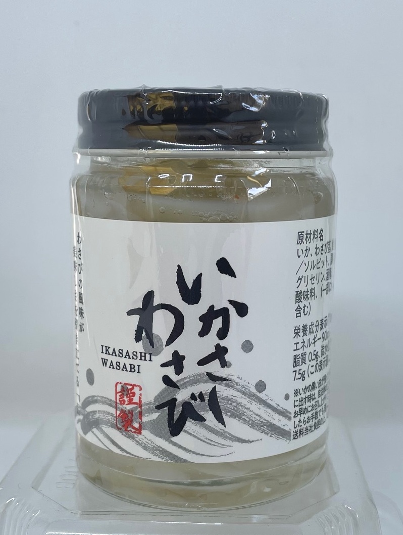 原材料名:いか(ベトナム)、わさび茎、食塩、還元麦芽糖/ソルビット、調味料(アミノ酸等)、グリセリン、酒精、香辛料、増粘多糖類、酸味料、(一部に小麦・いか・大豆を含む)