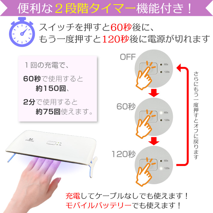 【タイマー】60秒/120秒 本体上部のスイッチを1回押すと60秒後に、2回押すと120後に電源が切れます。さらにもう一度押すとオフに戻ります。