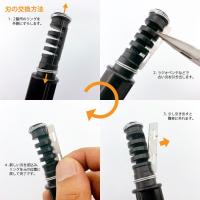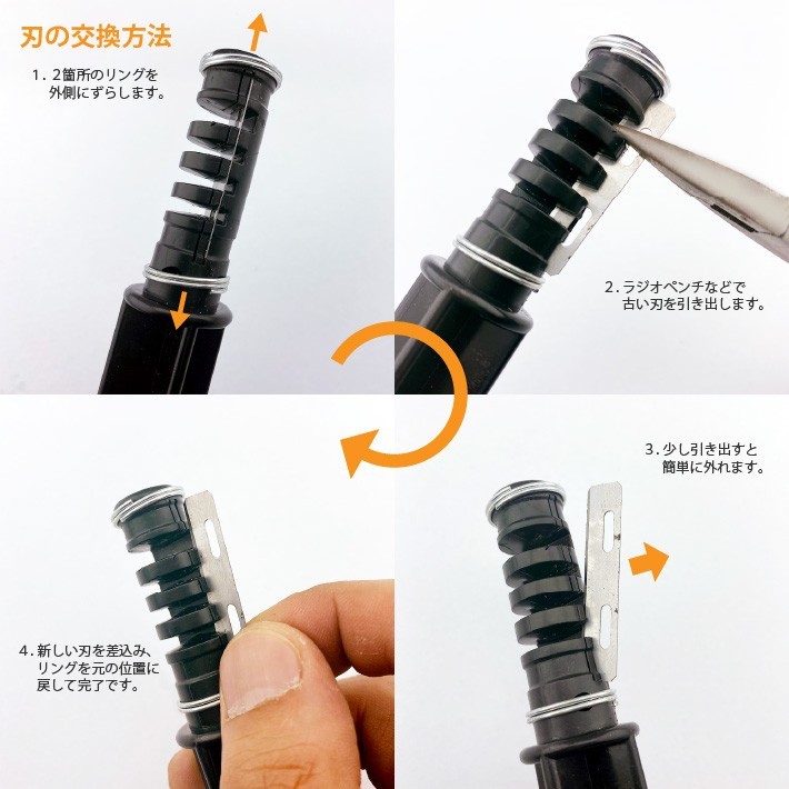 【刃の交換方法】留め具のリングをそれぞれ上下にスライドさせて刃をペンチ等で引き抜く、替刃を差し込み留め具のリングを元に戻す。