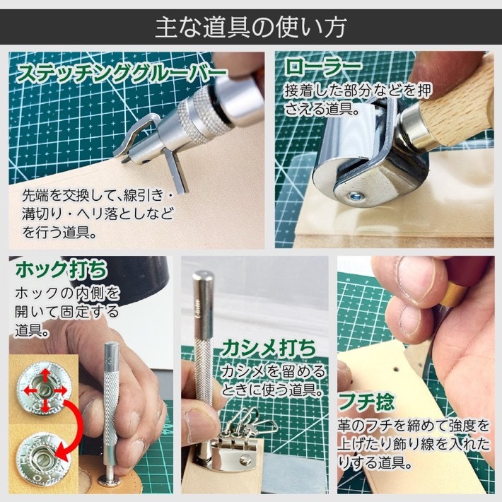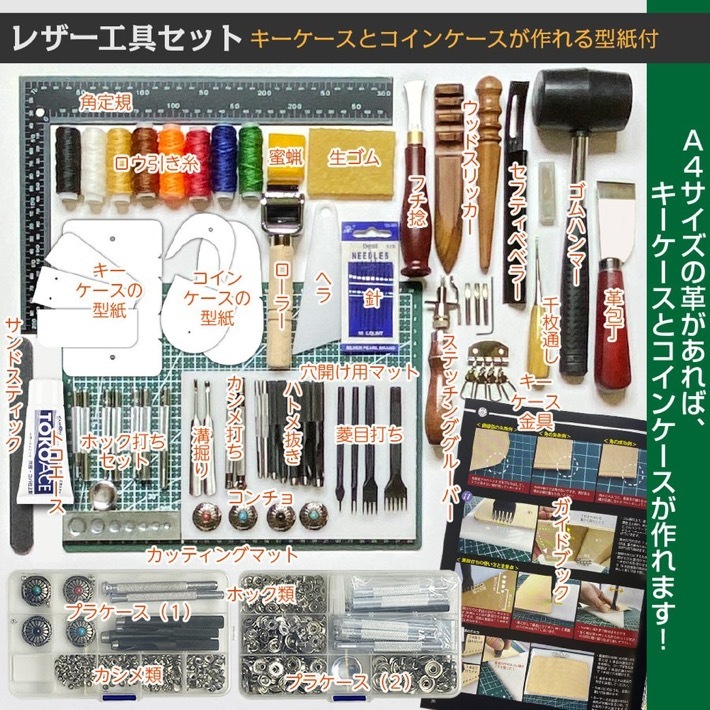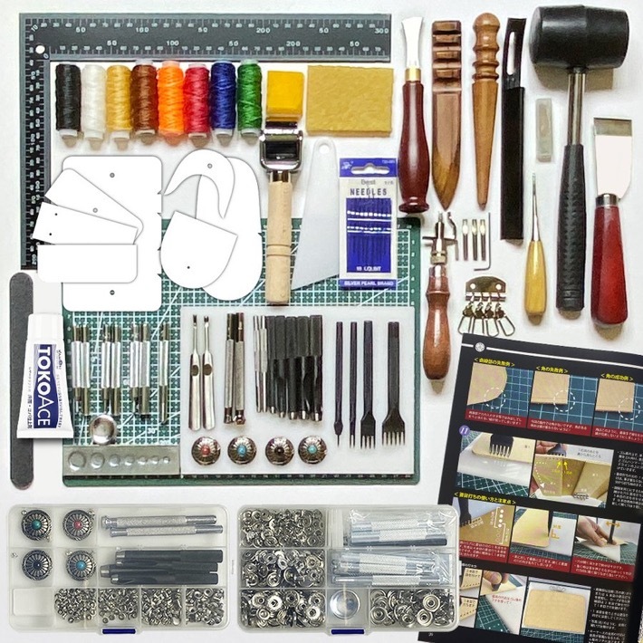 【セット内容】4mmピッチの菱目打ち(4本セット)/ゴムハンマー/穴開け用マット/革包丁/A4カッティングマット/千枚通し/マルチステッチンググルーバー/ローラー/フチ捻(1.5mm)/セフティべベラー/ヘラ/サンドスティック/スリッカー(2本)/溝堀り(U・V字)/角定規/生ゴム/蜜蝋/ホック打ち具セット/カシメ打ち具(2サイズ)/ハトメ抜き(7サイズ)/針セット/ロウ引き糸8色/キーケース金具/コンチョ4種/3種類の大きさのバネホック/15mmのジャンパーホック/2種類のサイズの片面カシメ・両面カシメ/2種類の型紙/ガイドブック/トコエース(トコ仕上剤)
