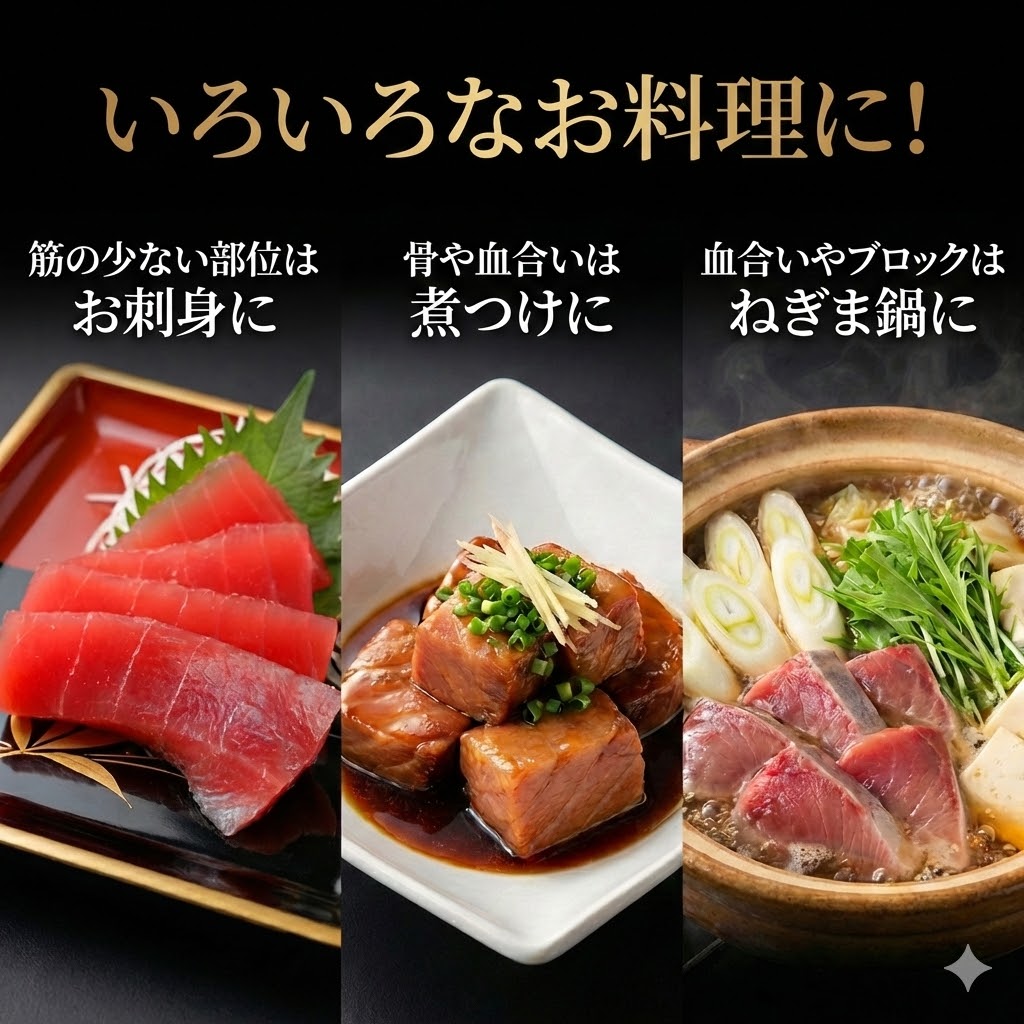 天然のメバチマグロは昔から日本人が食べなれている味であり、骨があったり血合いの箇所は調理してお楽しみください。