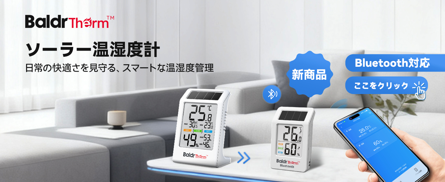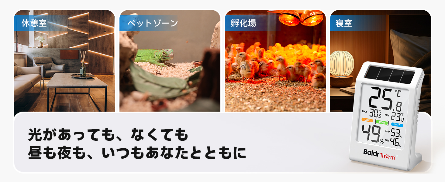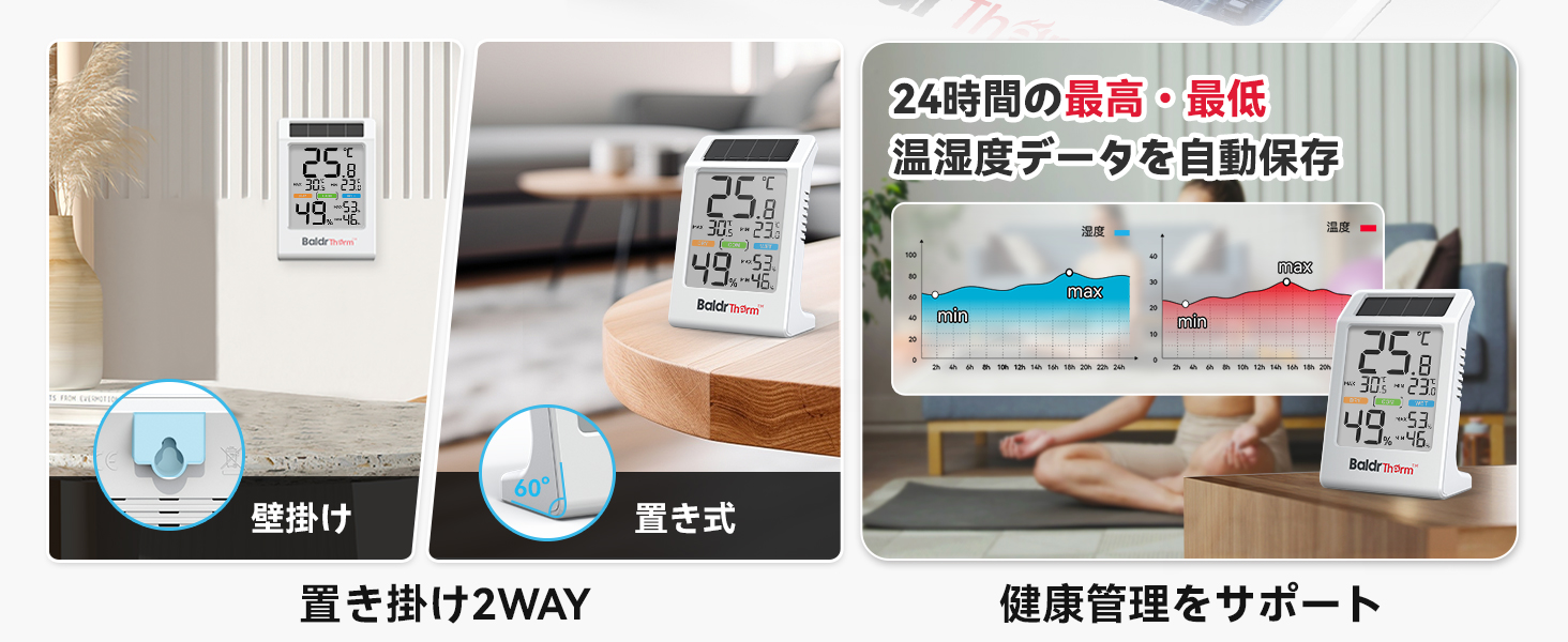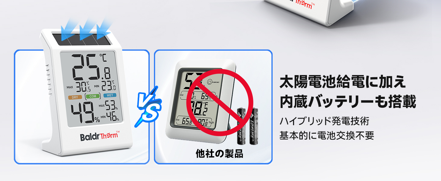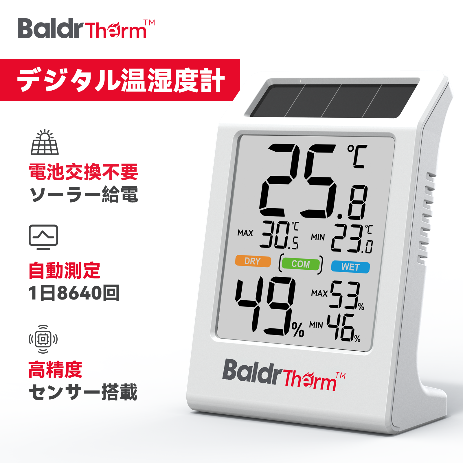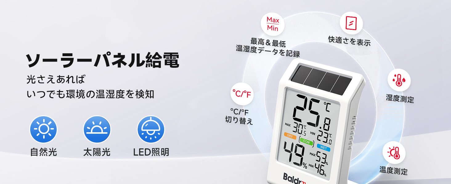 BaldrTherm デジタル温湿度計 ソーラー温湿度計 太陽光パネル温湿度計 省エネ 湿度計 温度計 快適度顔表示付 壁掛け 卓上スタンド 高精度 コンパクト 大文字