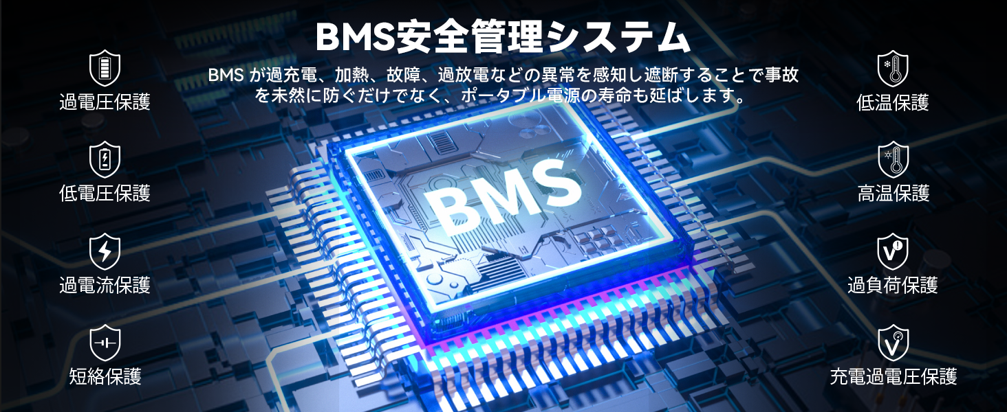 安全性が大幅に向上するリン酸鉄リチウムイオン電池搭載、熱分解温度が高く、熱安定性や安全性が非常に優れています。長寿命で充放電サイクル回数は4000回可能です。