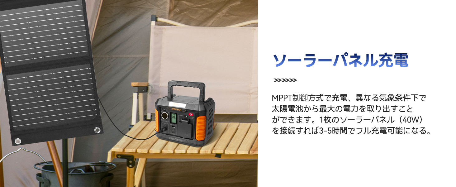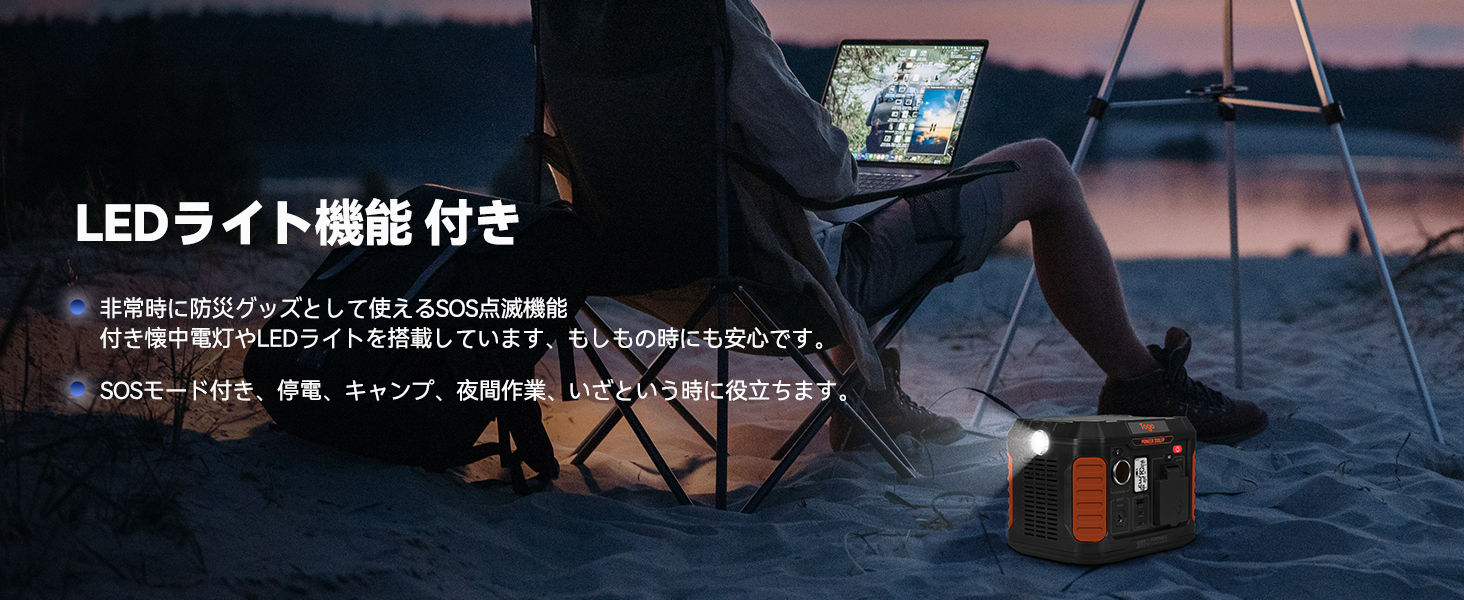 大容量ポータブル電源、純正弦波AC出力は300W(サージ450W)の機器に給電できます!アウトドア、車中泊 、キャンプ、屋外作業、停電や災害時が使用できない時の備え補助バッテリーにも最適です。
