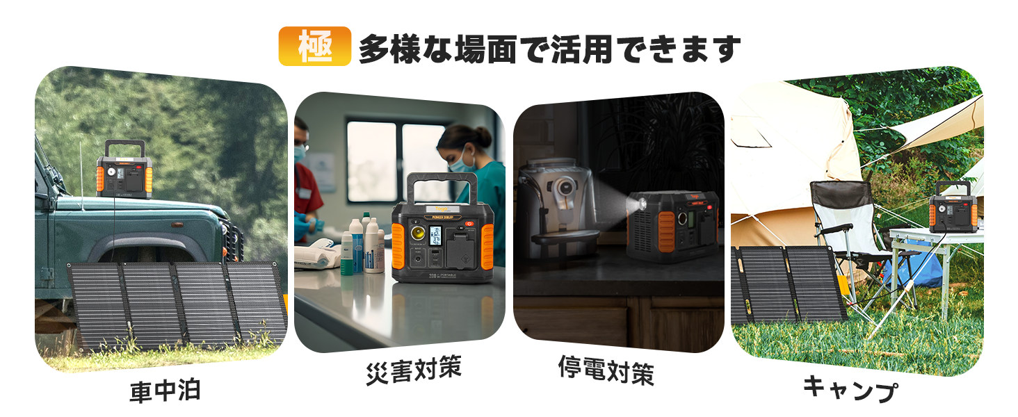 本仕様AC100V出力で50/60Hz周波数両対応するバックアップ電源として、家庭で使われる電気製品の多くは使用できるようになっています。アウトドア、車中泊 、キャンプ、屋外作業、停電や災害時が使用できない時の備え補助バッテリーにも最適です。