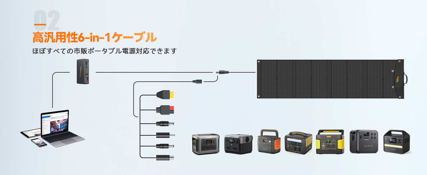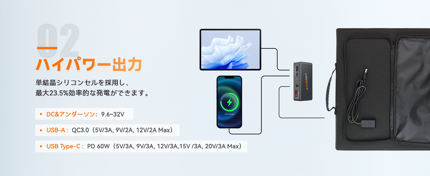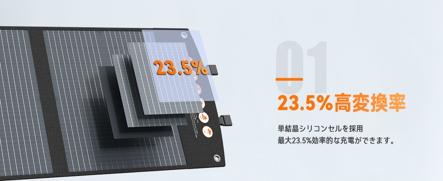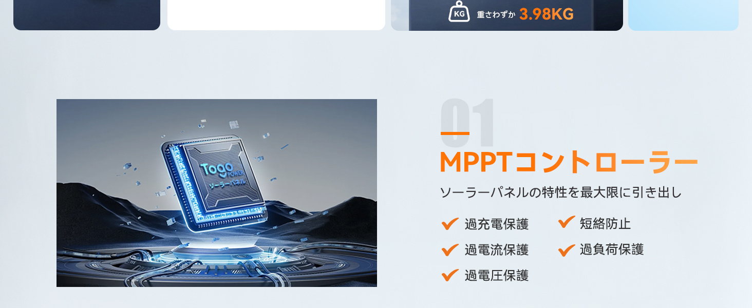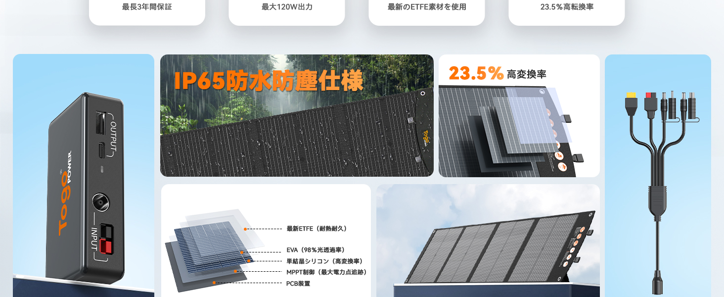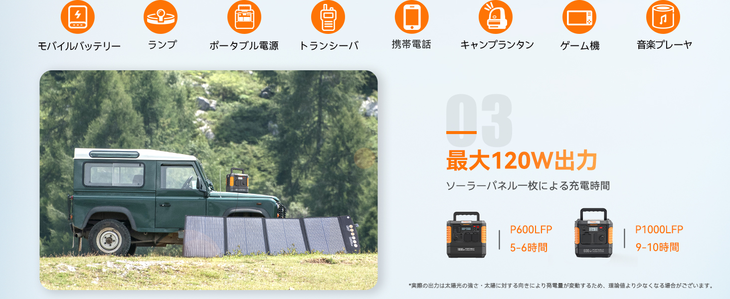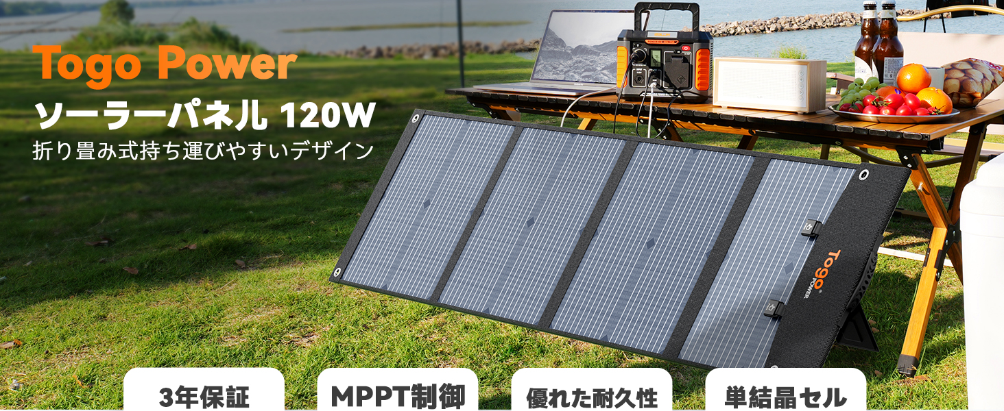 安全性が大幅に向上するリン酸鉄リチウムイオン電池搭載、熱分解温度が高く、熱安定性や安全性が非常に優れています。120WソーラーパネルはMPPT制御方式を採用したため、異なる気象条件下で太陽電池から最大電力を取り出すことができます。