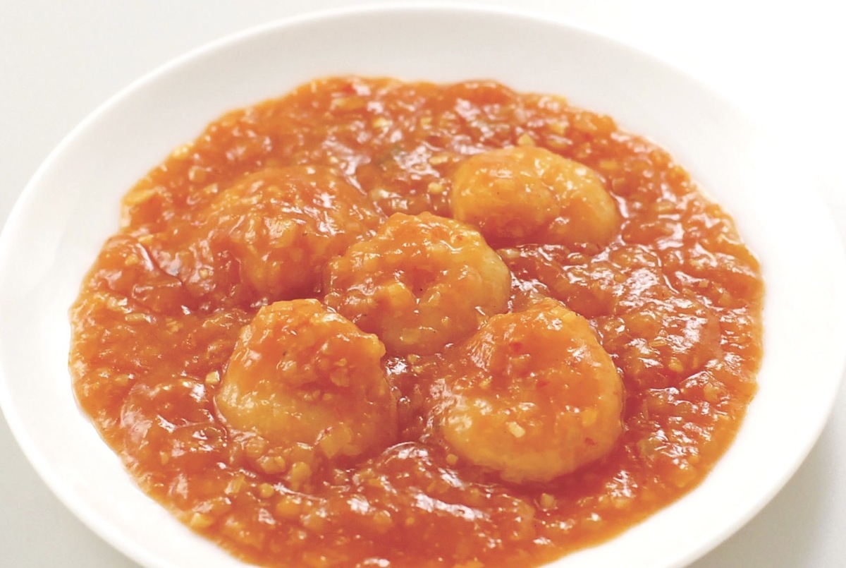 【原材料名】 エビチリソース(トマトケチャップ、豆板醤、濃厚ソース、酒醸(米こうじ、もち米粉)、砂糖、鶏ガラスープ、みじん切りにんにく、みじん切り生姜、鶏・豚ガラスープ、チキンパウダー、食塩)(国内製造)、むきえび(えび(タイ産)、食塩)、長葱(国産)、食用大豆油、酒醸(米こうじ、もち米粉)、醸造酢、コーンスターチ、みじん切りにんにく、みじん切り生姜、液卵白、食用調合油、馬鈴薯でん粉、白胡椒、唐辛子、生姜、花椒(山椒の実)、シナモン/重曹、調味料(アミノ酸等)、pH調整剤、糊料(ローカスト)、香料、カラメル色素、酸化防止剤(V.C、亜硫酸塩、V.E)、ポリリン酸Na、酸味料、(一部にえび・小麦・卵・ごま・ゼラチン・大豆・鶏肉・豚肉を含む)
