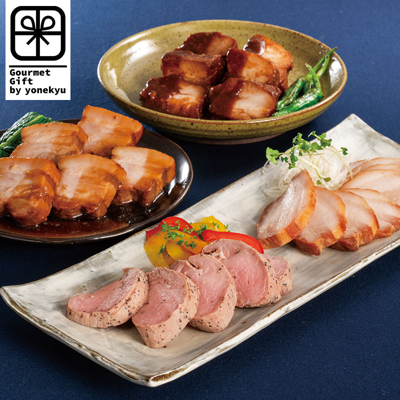 【商品内容】小さな豚肉の味噌煮込み210g×1袋、小さな豚肉の和醤煮込み210g×1袋、豚ひれ肉のやわらかローストポーク100g×1袋、米久の本焼豚ハーフサイズ180g×1袋