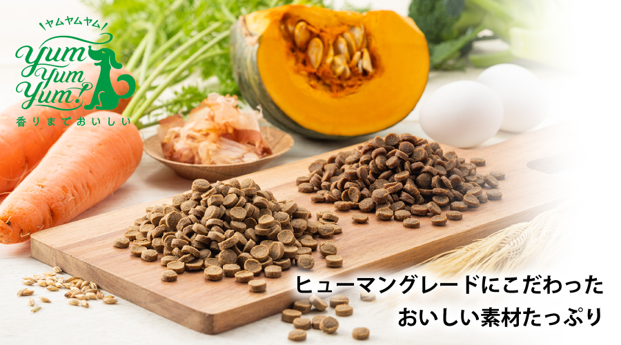 yum yum yum! は、毎日のおいしいごはんで家族のしあわせをつくる、を目指して生まれたドッグフード。愛犬の健やかな毎日のために、私たちの食事と同じレベルの品質を追求し、素材の香りを感じられるほどのおいしさにこだわってつくりました。