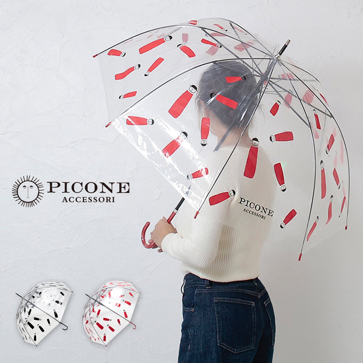 | 商品紹介 | ピッコーネがランダムに配置された人気ブランドPICONE ACCESSORIらしい大人可愛いビニール傘。パッと開けて便利なジャンプ傘。クリアー透明で周囲が見えやすく、雨の日も安全です。持ち手から傘先まですっきりとしたフォルム。雨の日に、傘を持ち歩く際も明るい気持ちになれそうな長傘です。 |