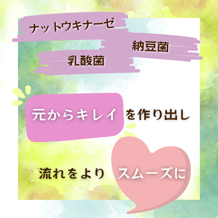 納豆菌とナットウキナーゼのコンビネーションが相乗効果をグングン発揮!元からキレイを作り出し、流れをよりスムーズに