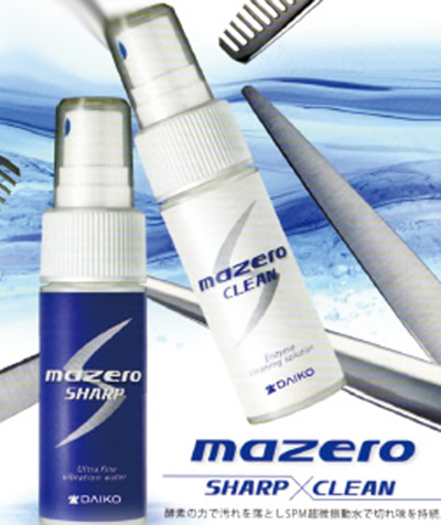 マゼロは精密機器分野で超微振動エネルギーで刃物を磨く技術を一般の刃物に応用した製品です。シャープな切れ味を活性化させ施術者のカッティング感覚をサポート。また、医療機関で手術道具を洗浄する用材を併用することで除菌・抗菌・防臭にも効果てきめん。 マゼロシャープ … 遠赤外線波長近辺周波数の振動エネルギーを水に与えたのがSPM超微振動水。この水に刃物を浸すと金属分子間の結合力を高め、金属の強度と靭性が増し、刃先の切れ味が甦るとともにその効果が長時間持続します。マゼロクリーン … マゼロクリーンに含まれている「プロテアーゼ」は頭皮をカットした際に付着したタンパク質を酵素分解し、刃物の清潔さを保ちます。また「ポリオキシエチレンアルキルエーテル(非イオン系)」や「植物性抗菌エキス」も配合し抗菌・防臭効果も。いずれも天然素材で人に優しく効果が長時間持続します。(使用方法)容器に200ccの水またはぬるま湯を用意し、マゼロをそれぞれ2プッシュ (1cc) 入れ、ハサミなど刃物を30分程漬け込みます。容器から出し、水分を拭き取れば完了です。