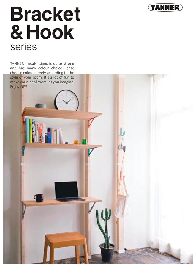 メタルっぽい印象をなくし、木材となじむような色づかいをして居心地のいい家を演出する事ができる棚受金具とフックです。