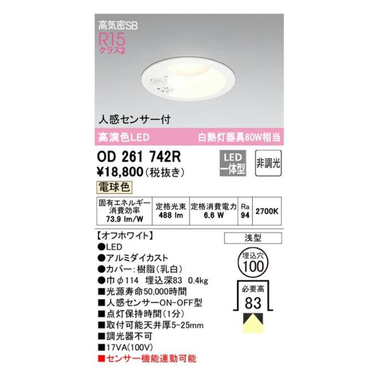 オーデリック LED一体型ダウンライト オフホワイト OD261742RS 電球色 人感センサーON-OFF型 白熱灯器具60W相当