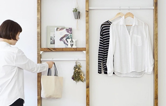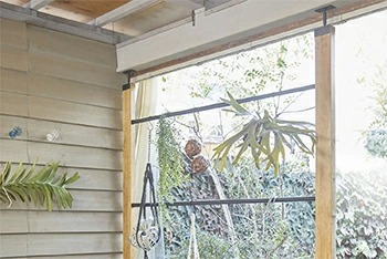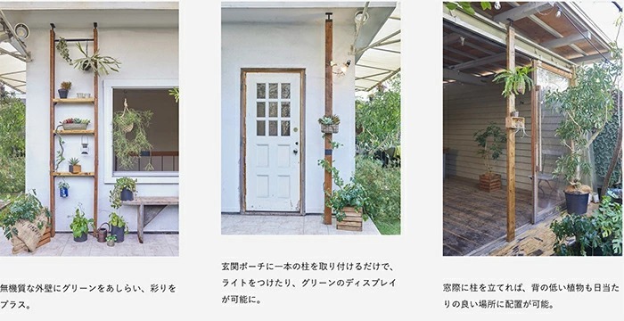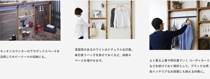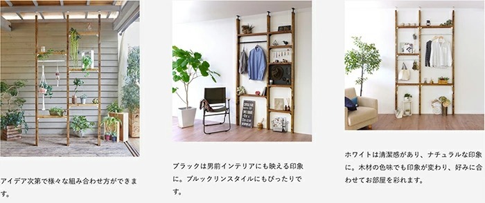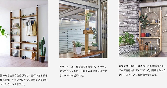 ![]() | 「伸縮アイアンロッド」で更に使用シーンが広がる 木材の柱に付属の専用ソケットをねじで取り付け、伸縮タイプのロッドを引き伸ばして差し込み、ひねって固定するだけ。一人でも簡単に取り付けられます。 屋外でも使用できるアイアン素材で、両端がスッキリ見えるシンプルなデザインです。ハンガーで洋服を掛けたり、S字フックと組み合わせればグリーンを掛けることもできます。 |