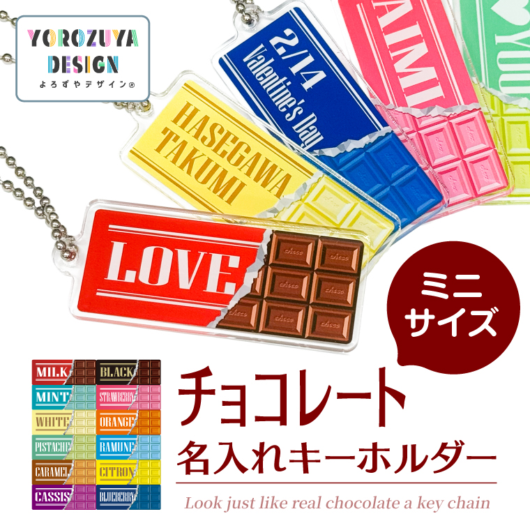 チョコレートの様な見た目のチョコ風キーホルダーにミニサイズが新登場!推し活にもおすすめな12color。各色はチョコのフレーバーをイメージしています。(ミルク・ブラック・ミント・ストロベリー・ホワイト・オランジュ・ピスターチ・ラムネ・キャラメル・シトロン・カシス・ブルーベリー)名入れ対応ですので、お好きな名前を入れる事が可能です。ポーチのストラップや、鍵などの小物につけるストラップとしてもおススメ。汚れに強いアクリル製。表面は凹凸がなくつるっとしています。片面・両面に限らず印刷面を保護するコーティング印刷を丁寧にしてのお届けです。プレゼント、特にプチギフトとして好評です。特殊な印刷機によるダイレクトプリントです。シールではございませんのでご安心ください。