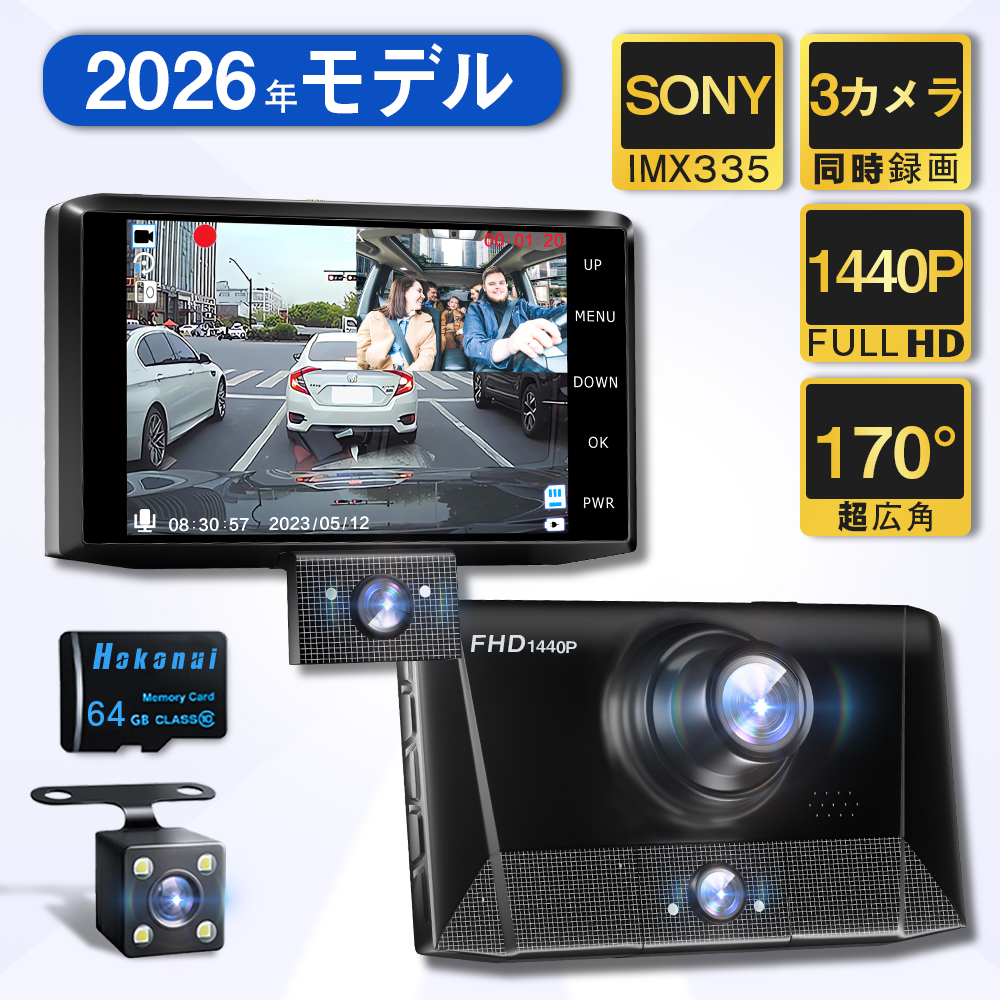 【多機能ドライブレコーダー】3カメラ同時録画、音声録画、LED信号対応、衝撃録画・Gセンサー、駐車監視、暗視機能、バックガイド機能、ループ録画機能、WDR機能、エンジン連動。また、駐車監視機能付きドライブレコーダーを選べば、駐車場での当て逃げや盗難、いたずら等の証拠を残すことが可能です。【最新進化版&3カメラ同時高画質録画ドラレコ】前方フロントカメラ、車内カメラ、後方リヤ(リア)カメラ搭載、 3カメラが同時高画質録画できます。前後をしっかり撮影しつつ、車内まで記録するので、近年話題になっている煽り運転、その他追突事故に合った時などドライブレコーダーの映像が大切な証拠となります。【WDR機能搭載】光の明暗差を補正し、夜間の撮影が半端なく綺麗で映ります。夜間のみではなく、雨の日逆光、白飛びや黒つぶれなどを修正し、ナンバープレートも捕まえます。【64GBのメモリーカード】ル-プ録画機能付き、ドライブレコーダーには64GBのメモリーカードを取り付けて、エンジンのON/OFFに連動して、自動で記録を開始/終了します。また、自動的に古いフアイルから上書きされます。【前後超広角撮影】170°の明るい広視野角レンズで前方に搭載し、正面視界を拡大し、撮影しにくい死角を捉えます。リアカメラには140°の視野で撮影できるレンズが搭載されており、前後の両方とも広い視野を見ることができ、運転をより便利になります。※本製品は出荷検査済みですが、配送途中に衝撃を受けて故障する可能性を排除できないため、車に取り付ける前に、電源を接続し、作動検査してください。起動検査する際に、本製品に付属しているシガーソケットケーブルでテストしてください。