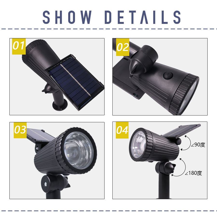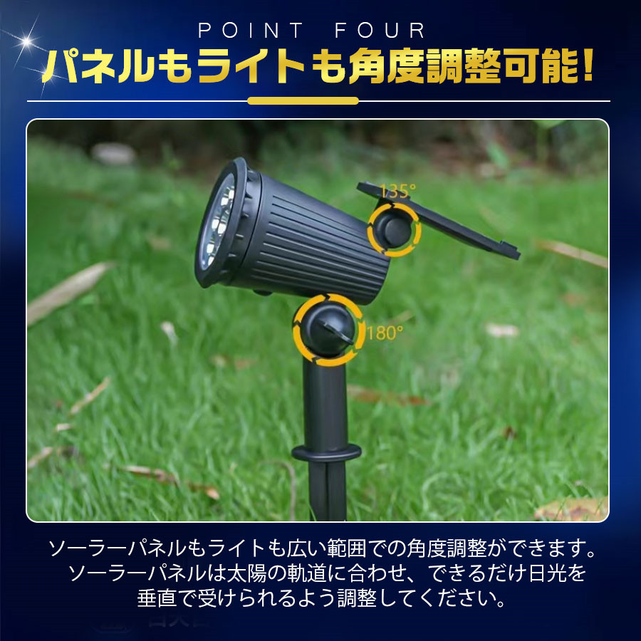 光センサーが搭載され、日中は自動的に消灯してソーラーパネルによって充電され、夜間は自動的に点灯します。