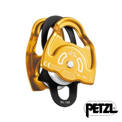 プルージック結びと組み合わせてセルフジャミングプーリーとして使用できるダブルプーリーです。