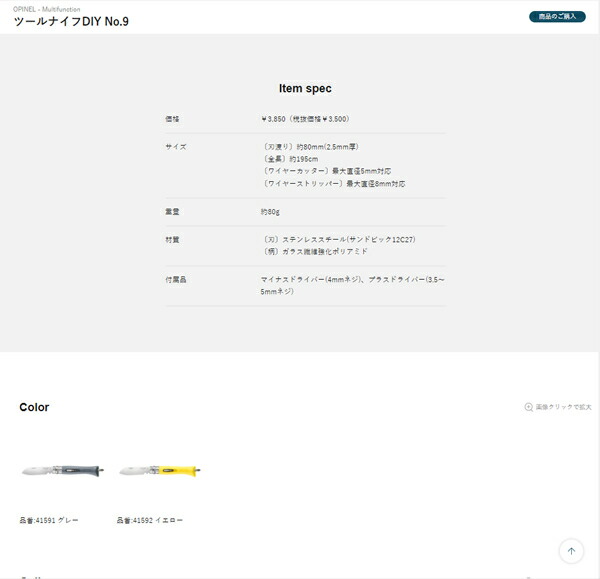 | 【材質】 | 〔刃〕ステンレススチール(サンドビック12C27) 〔柄〕ガラス繊維強化ポリアミド |