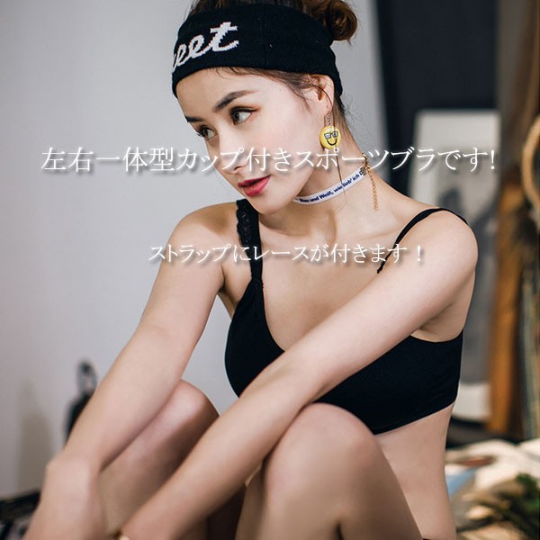 左右一体型カップ付きスポーツブラです。ストラップにレースが付きます!バックにゴムが付いているので体の動きを妨げずにバストの揺れを抑えます。ノンワイヤー設計で締め付け過ぎずソフトな着心地♪取り外し可能の左右一体型のモールドカップでバストをやさしくホールド♪吸汗速乾の素材で、汗をすばやく吸収・発散して快適な着心地です。合わせるだけ、手持ちのアイテムがオシャレになるマストアイテム♪普段のトップスからただ少し覘かせるだけでオシャレ度UP!普段もちろん、スポーツとヨガなどでも使えます!