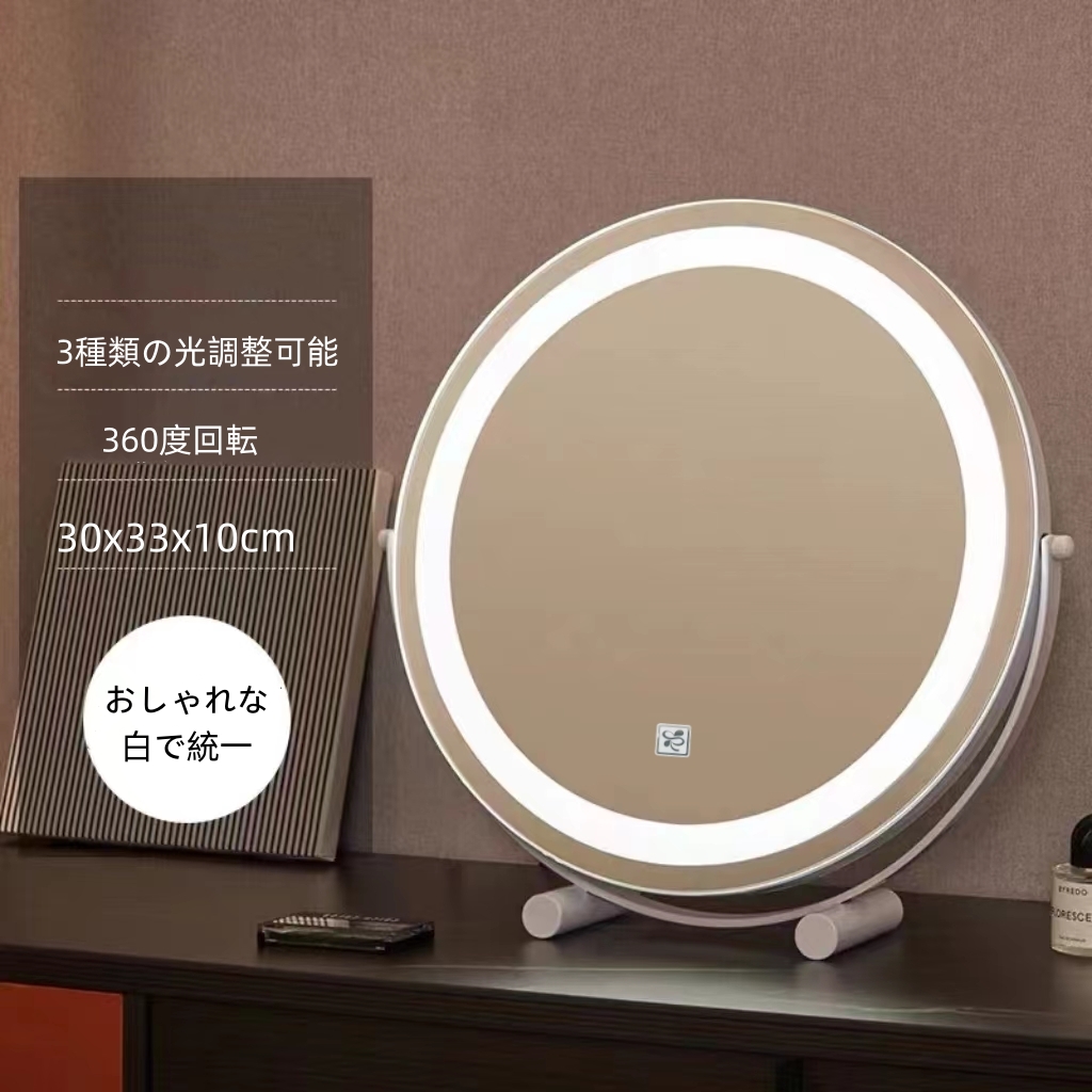 卓上 LEDミラー 化粧鏡 メイクミラー 卓上鏡明るさ調整可能 三色照明モード丸型ミラー ライトミラー姫系鏡回転LEDミラー30/40cm