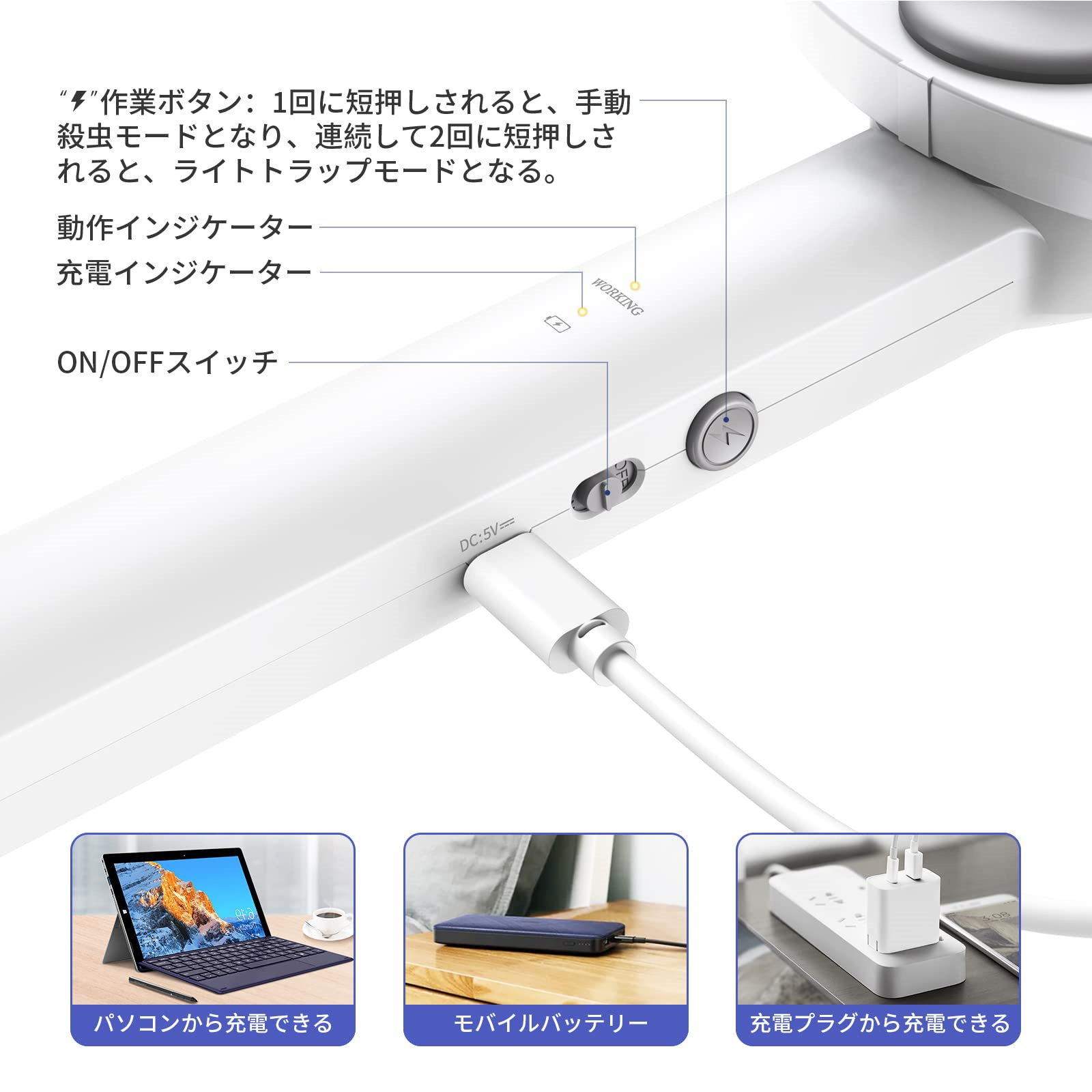 バッテリー容量は1200mAh、2時間で完全に充電できます。1回完全充電した後、長時間使用することができます。日中にUSBで十分に充電しておけば、コンセントのない場所でも虫を退治できます。