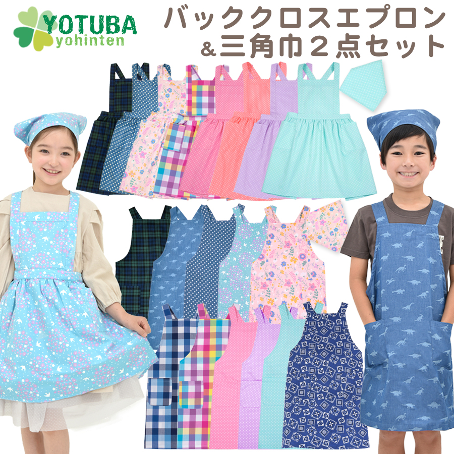 バッククロス エプロン&三角巾 2点セット ピンク サックス デニム ブラックウォッチ キッズ 男の子 女の子 110 120 130 140 150 おしゃれ よつば洋品店