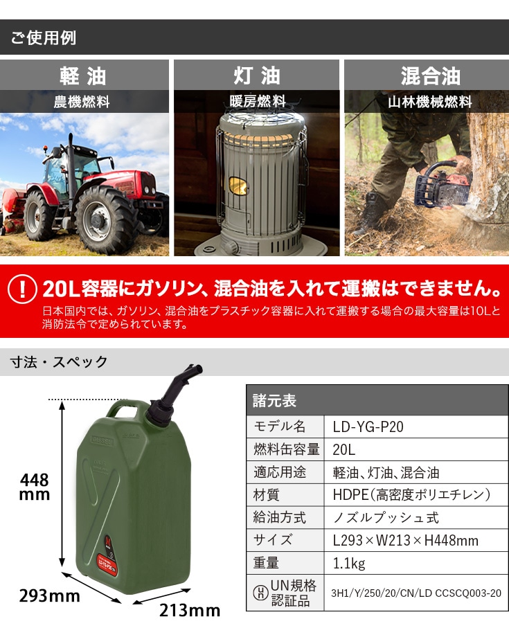 農産林機械(軽油)/アウトドア・DIYツールや暖房器具(灯油)/園芸機械(混合油)などの燃料の携帯に。