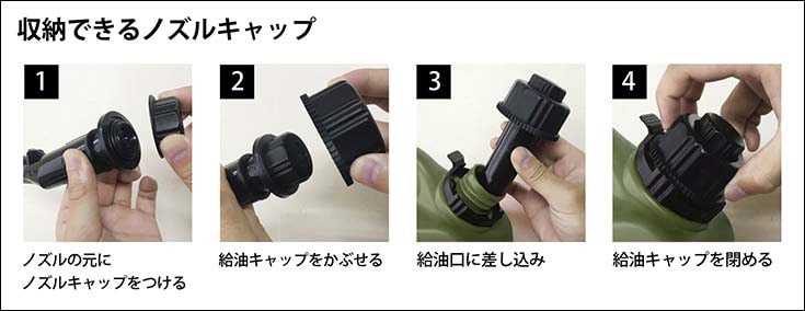 ノズルはプッシュチャージ式で、燃料缶を押し下げると燃料が流れ、戻すと弁が閉じ、燃料の供給をストップするので安全に給油できます。