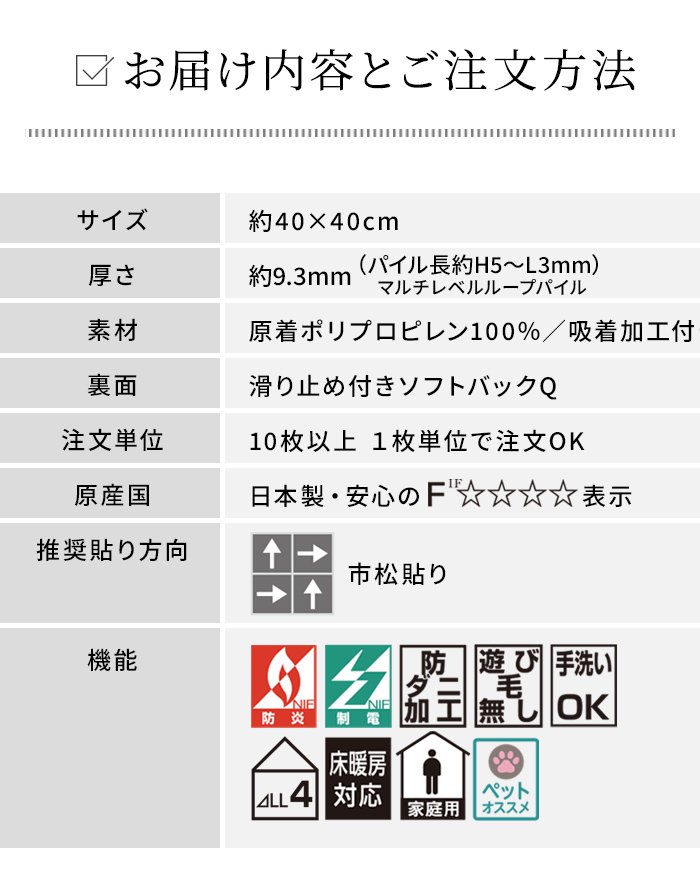 ◆機能:防炎加工、遮音、制電加工、防ダニ加工、手洗いOK、遊び毛無し、床暖OK