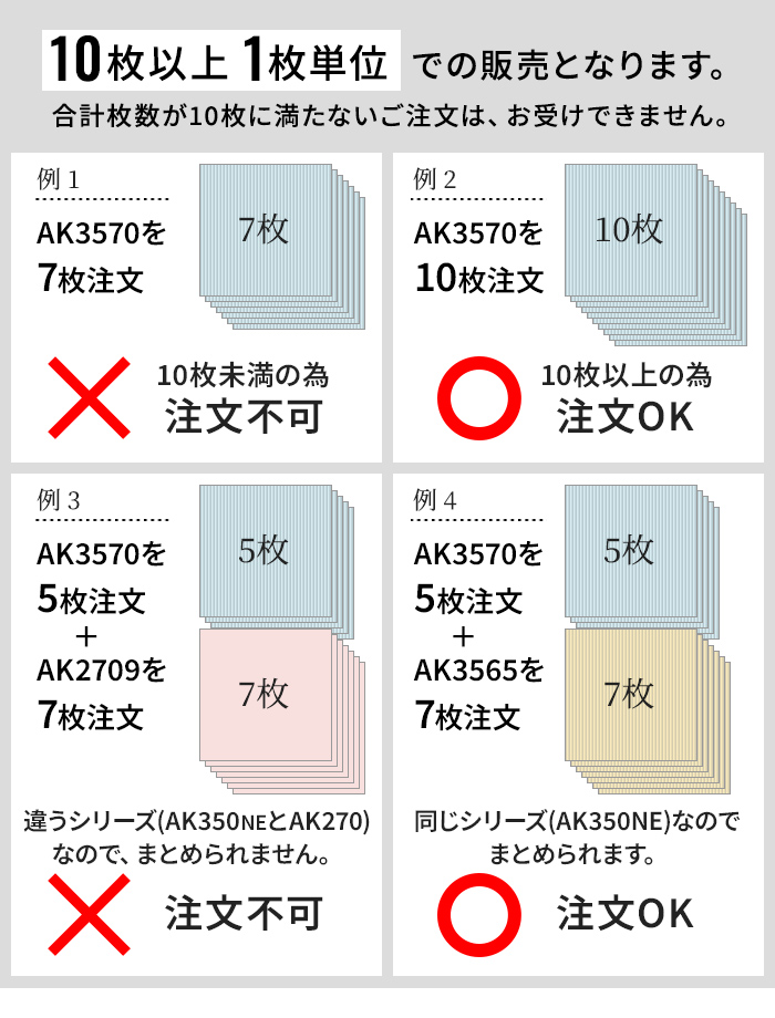 合計枚数が10枚に満たないご注文はお受けできませんので、ご了承下さいませ。| (例1) AK3502を8枚 | : ご注文はお受けできません。 |