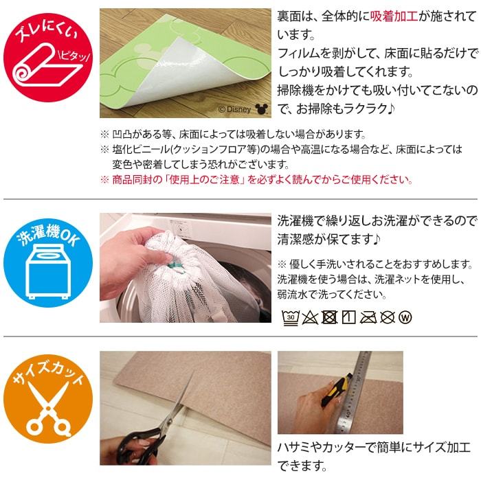 ■機能:滑り止め加工、洗濯機で洗える(※洗濯ネット使用)、貼って剥がせる、お掃除ロボットOK、サイズカットOK