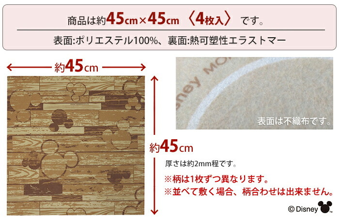 ||45×45/4枚組/ミッキー/シルエット/洗える/フリーカット/正方形/吸着/タイル/mat/セット/ジョイント/滑り止め/木目/ウッド調/モノグラム/洗面所/キッチン/ペット/犬/猫/転倒/傷防止/吸着タイル/タイルマット/ベージュ/グレー/グリーン/ピンク/ブルー/オレンジ||