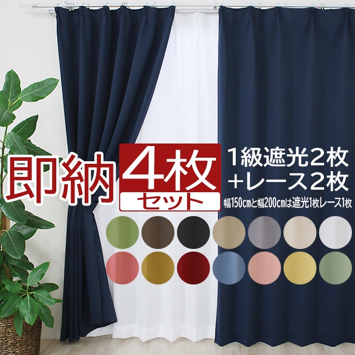 新生活にぴったり!フック付きの遮光カーテン2枚+ミラーレースカーテン2枚のカーテンセットです。(幅150cmと幅200cmは遮光1枚+レース1枚)
