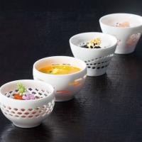 光をとおして文様が浮かび上がる蛍手(ほたるで)陶器。蛍手とは:透彫(すかしぼり)にした後、透明釉をその子穴に充填して焼成する技法。